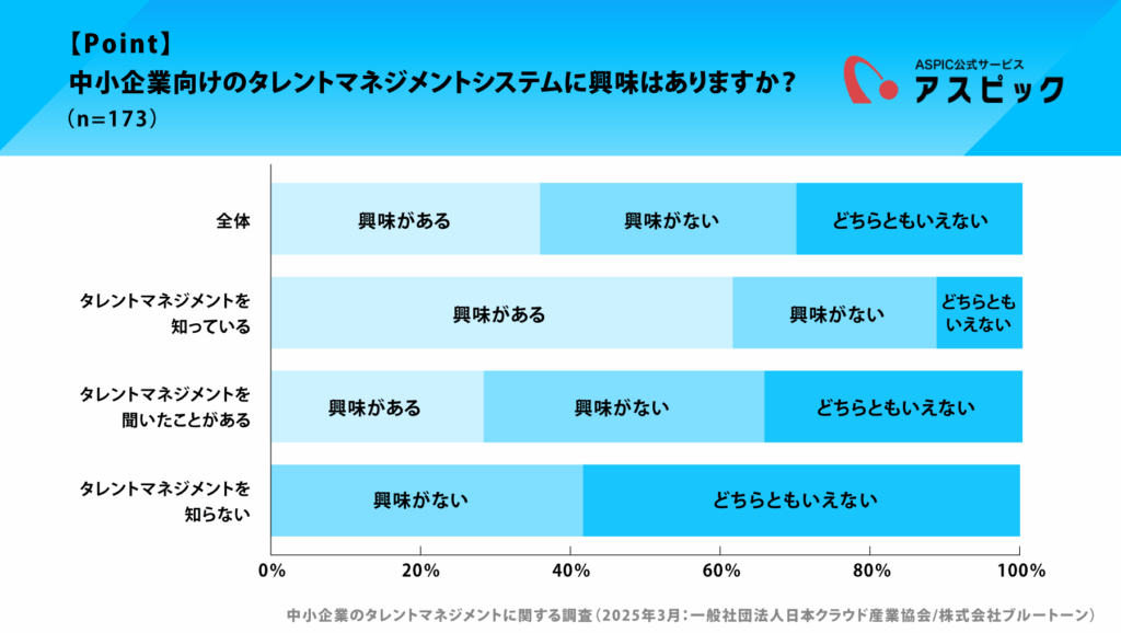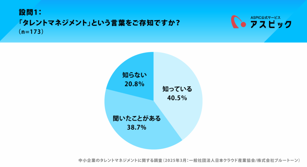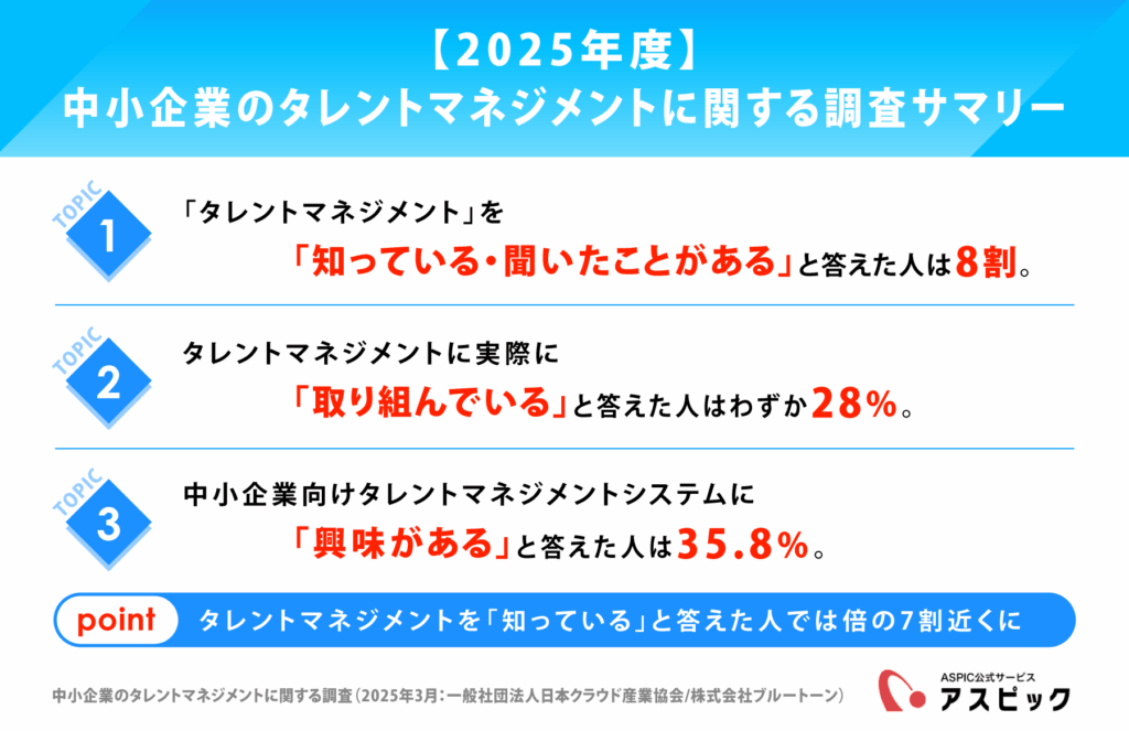 日本企業のビジネス支援に取り組む、法人向けクラウドサービス紹介サイト「アスピック」(運営:一般社団法人 日本クラウド産業協会(ASPIC)、運営委託先:株式会社ブルートーン)は、日本のSaaS市場調査・動向の一環として「中小企業のタレントマネジメント」についてアンケート調査を実施しました。